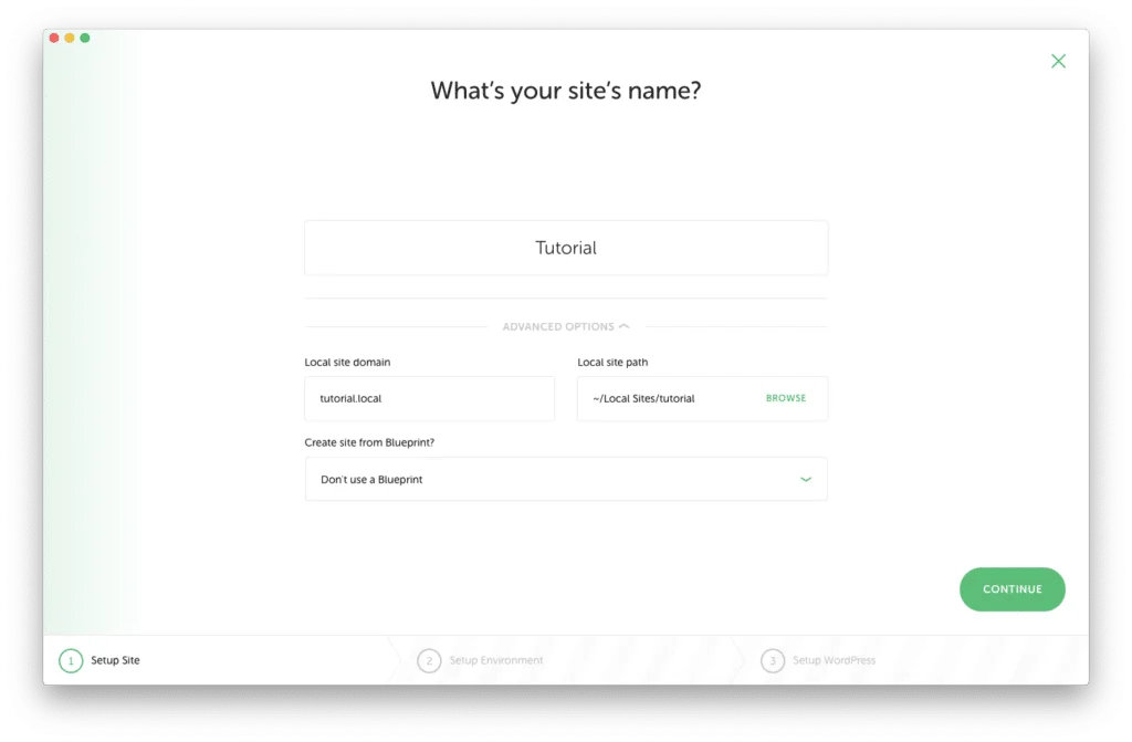 Here you can set a domain and path for your local site, and choose whether to create it using a Blueprint. This last option is a handy time-saving Flywheel feature that lets you set up a site using a predetermined set of themes and plugins.