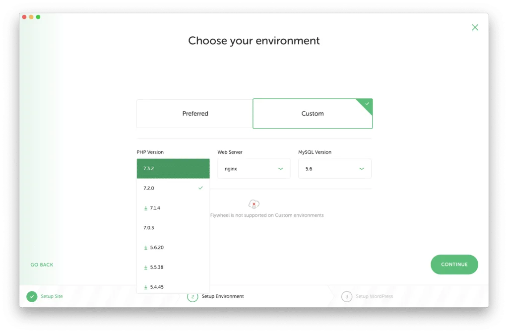 You can choose Preferred to set up your local site using a recommended set of tools, or select Custom to configure your environment: