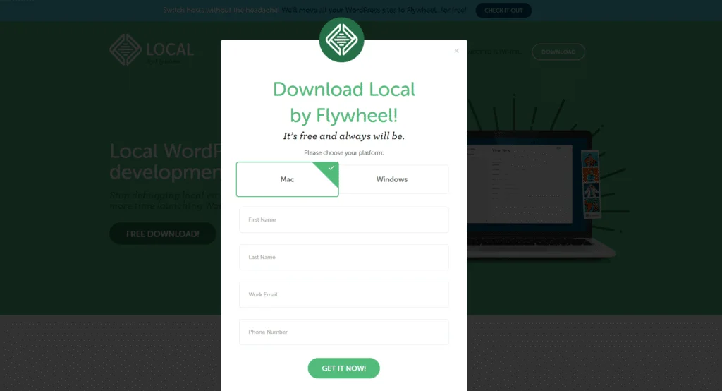 To download Local by Flywheel, visit the website and select the Free Download button. Next, choose your platform, and enter some basic information (only the email field is mandatory):
