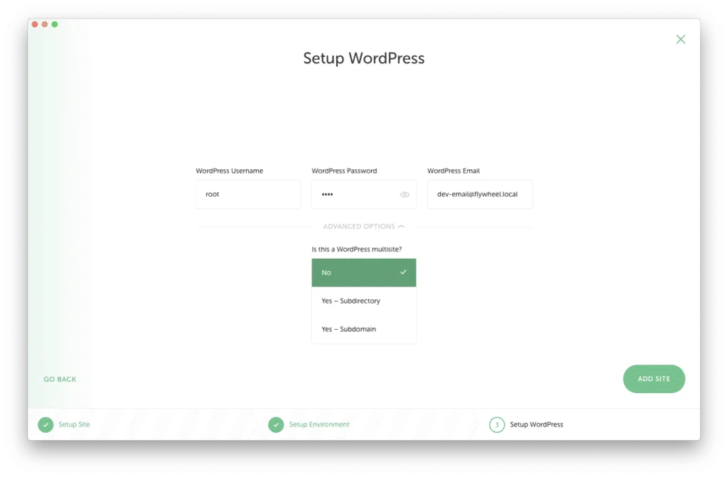 On this screen, you’ll create a WordPress username, a secure password, and an admin email address. Under Advanced Options, you can also specify if you’d like this installation to be a multisite setup. Then, hit the Add Site button.
